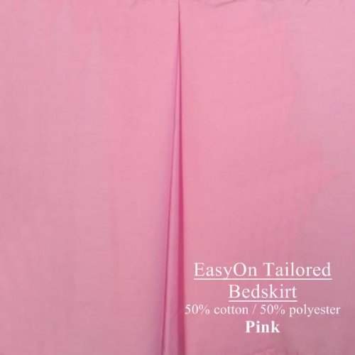 Tailored California King EasyOn Dust Ruffle 21 inch drop PinkTailored California King size Dust Ruffles that install WITHOUT removing your heavy mattress!!! EasyOn Dust Ruffles are incredible! If you've ever experienced the frustration of having to remove your mattress to put on a new Dust Ruffle, then you are going to LOVE our revolutionary EasyOn Dust Ruffles! They install EASILY - WITHOUT removing the mattress! Available in MANY colors and in a variety of lengths(drops) to fit any bed height! You may choose from 3 lengths: 15 inches, 18 inches or 21 inches. AB Lifestyles' EasyOn Dust Ruffle Collection is made of an excellent, decorator quality cotton-polyester blended fabric. The corners are split but they overlap, so this Bed Skirt hangs perfectly whether your bed has corner posts or not! Your EasyOn Dust Ruffle will arrive professionally packaged in a special box that allows us to ship it flat ~ avoiding wrinkling. The necessary pins and easy directions are included! Thank you for purchasing this quality USA made product from AB Lifestyles!.../ Tailored California King EasyOn Dust Ruffle 21 inch drop Pink / Dust Ruffles